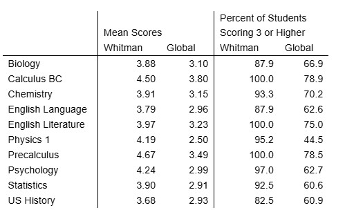 Over the past 4 years, 95% of Whitman graduates have scored a 3 or higher on at least one AP exam.